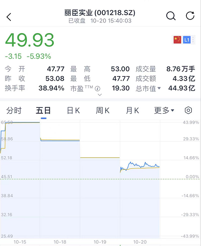 据数据宝,前两个交易日跌停,今天上午丽臣实业开盘再度跌停。截至收盘,该股报49.93元,跌近6%,总市值44亿元。值得注意的是,丽臣实业10月15日才登陆A股市场,也就是说,该股上市4个交易日,就一度连续3个跌停板。