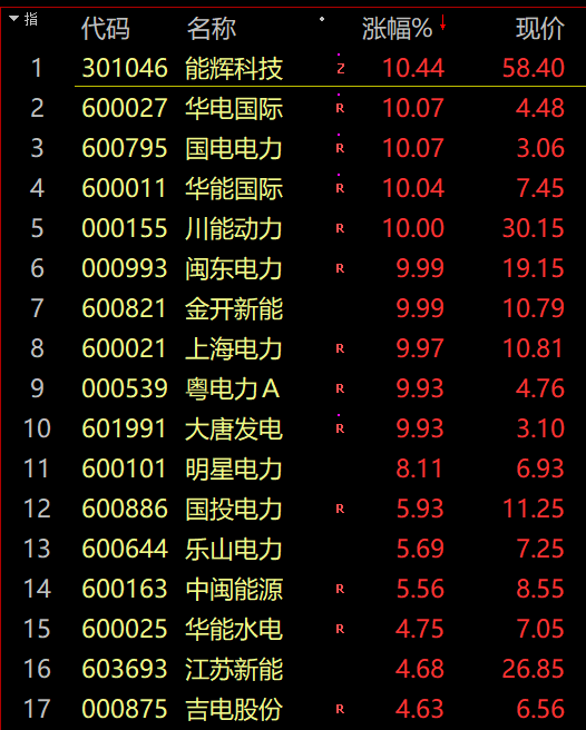 华能国际、华能电源等多股涨停;光伏及风电等新能源板块走高,隆基股份盘中涨近6%,绿色电力等概念板块涨幅居前。