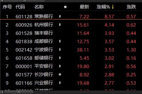 银行股中,常熟银行大涨逾8%,杭州银行涨超4%。