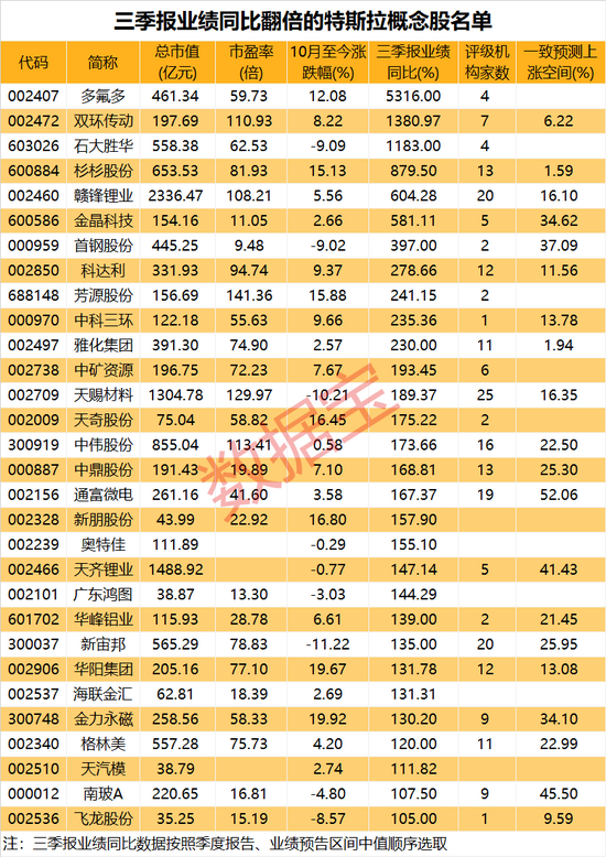 证券时报·数据宝统计三季报业绩同比翻倍的特斯拉概念股名单显示,11股获机构关注度较高,均有10家及以上机构参与评级。最受瞩目的3股分别为天赐材料、赣锋锂业和新宙邦,评级机构各有25家、20家和20家。另有11股机构预测上涨空间逾20%;通富微电以52.06%的幅度高居榜首,南玻A、天齐锂业紧随其后,上涨空间均在40%以上。
