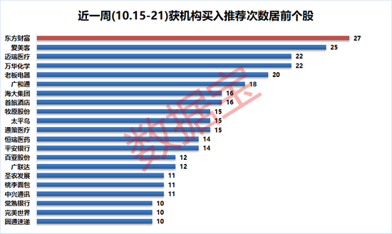 个股方面,共21股获10家及以上机构“买入”评级,主要为各行业龙头白马。本周,“券茅”东方财富机构“买入”评级累计高达27次;“医美茅”爱美客次之,“买入”评级25次;另有迈瑞医疗、万华化学、老板电器获得较多机构推荐,“买入”评级均逾20次。