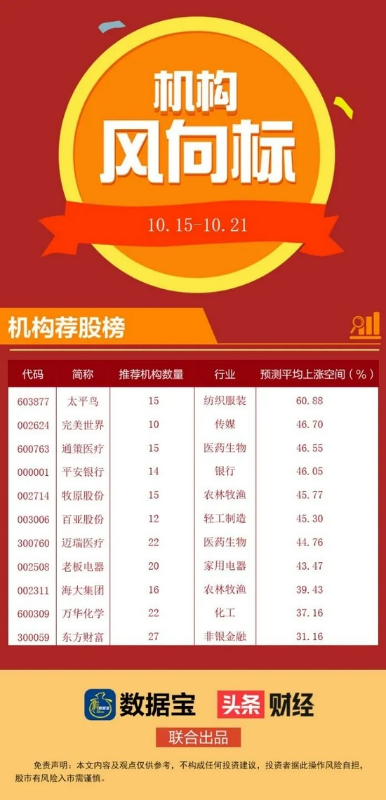 在获“买入”推荐10次及以上的21股中,多达18股机构看涨空间逾20%。太平鸟以60.88%的看涨空间一骑绝尘;完美世界、通策医疗、平安银行、牧原股份、百亚股份的看涨空间逾45%。