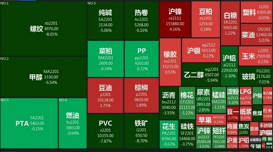 10月21日,国内商品期货收盘,黑色系大跌,焦炭、焦煤、动力煤、螺纹、玻璃跌停,铁矿跌超9%;值得注意的是,期市交投情绪火热,螺纹、沪镍、橡胶、豆油、棕榈、沪深2111合约成交金额均超1000亿,其中螺纹成交额超2000亿元。截至收盘,螺纹钢跌8.01%,报4976元;沪镍涨4.16%,报155880元;橡胶涨0.53%,报15235元;豆油涨1.75%,报10128元;棕榈油涨1.89%,报9830元。