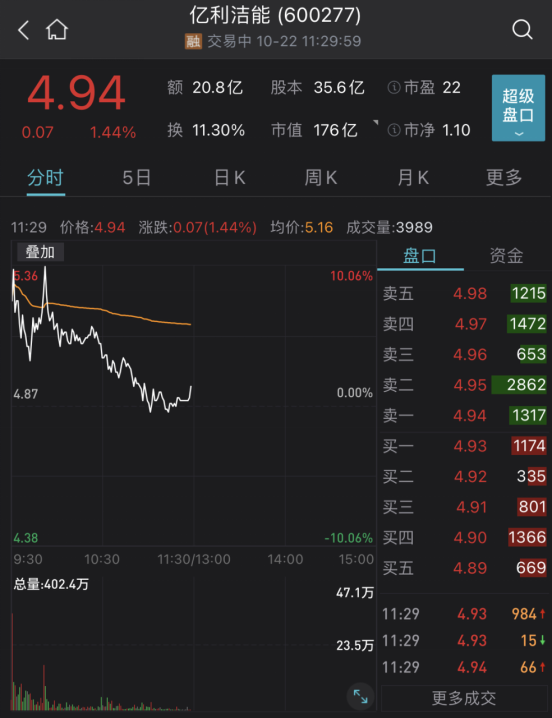 热门个股中,此前已经四连板的亿利洁能开盘涨停,但随后打开涨停板。截至午间收盘,上涨1.44%,报4.94元。