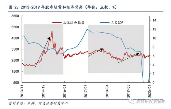 而从2013年之后,股市和经济的关系开始变得更加复杂。2014-2015年的经济(名义GDP)大幅下行期,股市在经济下滑的初段(2014年上半年)弱势震荡,在经济下滑最快的时候(2014年下半年-2015年上半年)是牛市,而到了经济下滑的后半段(2015年下半年),股市是熊市。2017-2019年名义GDP下行期,股市只在经济下滑最快的中段(2018年)有大幅的调整,在初段和末端均是结构性牛市,或者说是慢牛。