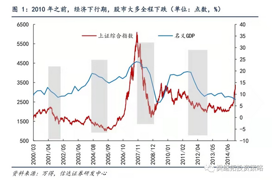 (1)历史上经济短周期对A股的影响一般都比较大。由于特殊的经济发展阶段和股市的板块构成,历史上,A股和1-2年的短期经济波动一般密切相关。特别是2010年之前,历次名义GDP下行期(2001-2002、2004-2005、2008、2011-2012),股市均是熊市,而且进场出现股市熊市持续时间比经济下行时间更长的情况。2004-2005年的经济下行,股市提前GDP拐点先调整,最终和GDP拐点同时见底,股市调整的时间比GDP调整的时间更长。