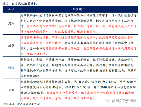 行业配置建议:金融股从绝对收益的角度已经进入价值区间,年底可关注相对收益的提升,在未来半年内是进可攻退可守的板块,券商、银行、地产均有机会。消费板块经过持续半年的调整,已经回归到估值合理范围,存在季度级别反弹的可能。由于政策的强力干扰,周期股出现了预期之外的大幅调整,整体性的机会后续将会减少,局部机会可关注最上游的煤炭、石油石化、种业等。