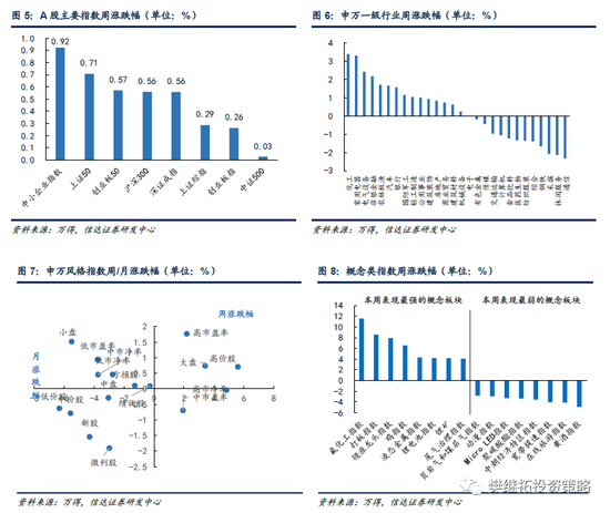 上周A股整体上涨,其中中小企业指数(0.92%)领涨。申万一级行业中,化工(3.39%)、家用电器(3.30%)、电气设备(2.42%)领涨,通信(-2.34%)、休闲服务(-2.14%)、采掘(-2.08%)领跌。概念股中,氟化工指数(11.58%)、打板指数(8.58%)、领涨龙头指数(7.90%)领涨,黄酒指数(-4.93%)领跌。