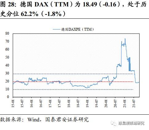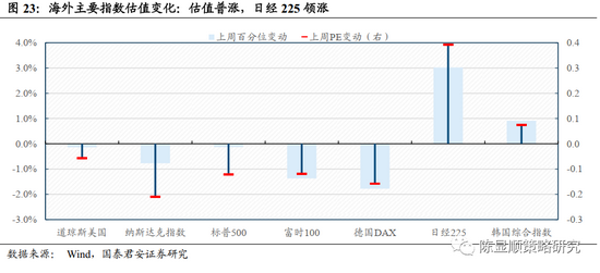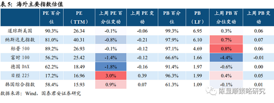 ?4)海外:上周海外各主要指数跌多涨少,日经225、韩国综合指数领涨,PE分位数上行幅度达3.0%和0.9%。德国DAX领跌,PE分位数下行幅度达1.8%。此外,道琼斯美国和标普500表现相对稳定。
