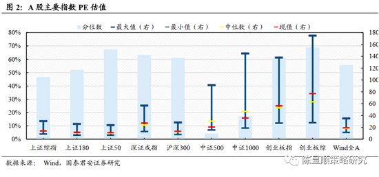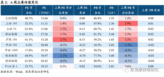 ?1)板块:上周各板块PE估值涨多跌少,从PE(TTM)历史分位变化来看,沪深300领涨,PE分位数上行2.7%,上证50和深证成指亦涨幅明显,PE分位数上行1.7%。创业板综领跌,分位数下行1.1%。