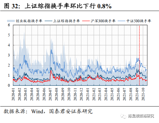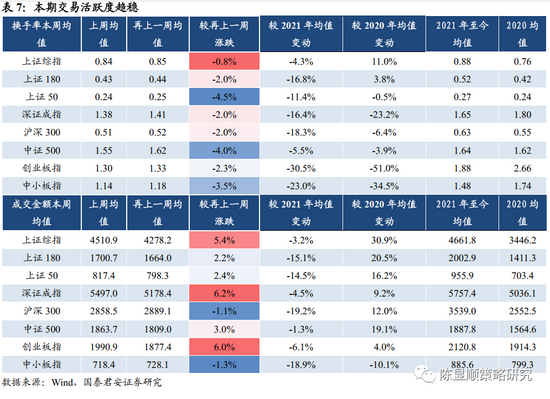 ?1)交易数据表现趋稳,两融余额小幅抬升。从换手率来看,各主要指数较上周小幅下行,其中上证50(-4.5%)领跌。从成交额来看,深证成指(6.2%)、创业板指(6.0%)领涨,沪深300(-1.1%)和中小板指领跌(-1.3%)。从涨跌停来看,上周涨停家数和跌停家数均下降,而跌停家数下降更趋明显。其中全A涨停家数环比下行5.4%,跌停家数较环比下行59.5%。此外,上周融资融券余额小幅抬升0.57%。