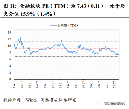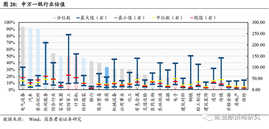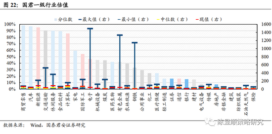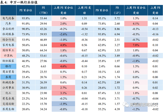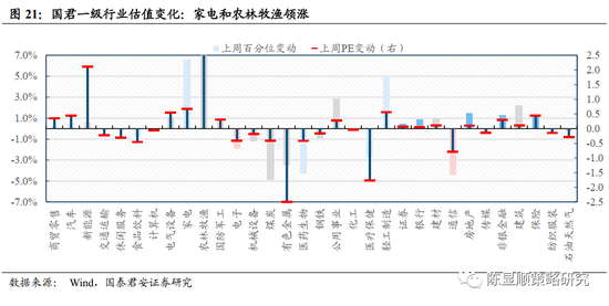 ?3)行业:上周各行业估值涨跌互现。申万行业口径下,家用电器和银行领涨。分板块看,周期板块采掘领跌,PE百分位下行4.3%。TMT板块中国防军工领涨,通信领跌。金融板块普涨,其中银行领涨,PE百分比上行4.6%。此外消费板块中家用电器和汽车领涨,PE百分比分别上行4.8%和2%。而在国君行业口径下,家电和农林牧渔领涨。