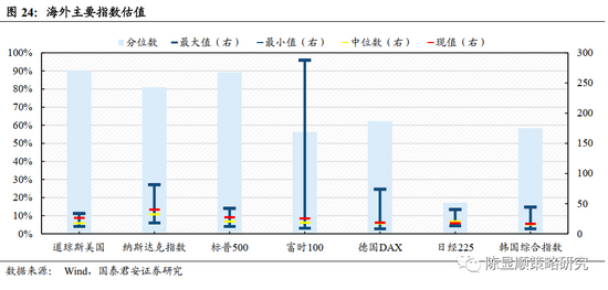 上周海外各主要指数跌多涨少,其中日经225、韩国综合指数领涨,PE分位数上行幅度达3.0%和0.9%。美国纳斯达克指数和富时100领跌,PE分位数下行幅度达1.8%和1.4%。此外各海外指数表现相对稳定,道琼斯美国和标普500 PE分位数下行-0.1%。