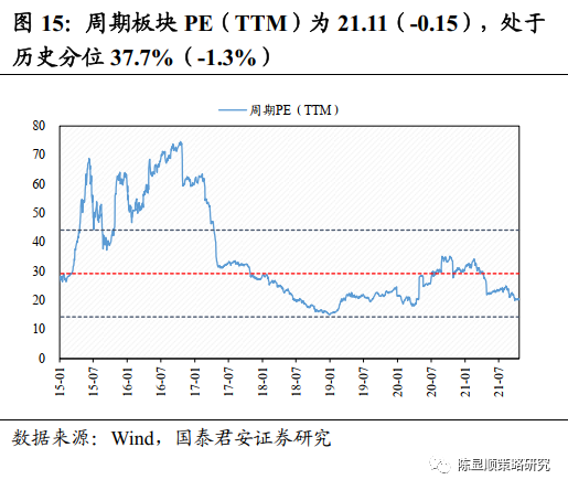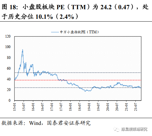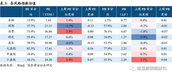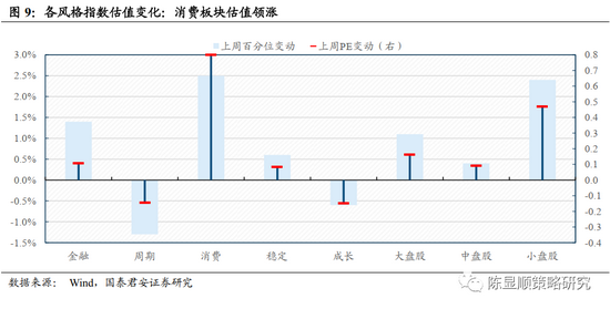 ?2)风格:从大小风格来看,小盘股领涨,PE分位数上行2.4%,大盘股和中盘股PE分位数分别上行1.1%和0.4%。从行业风格上看,消费板块领涨,PE分位数上行2.5%,周期板块领跌,PE分位数下行1.3%。