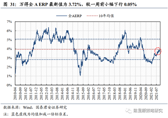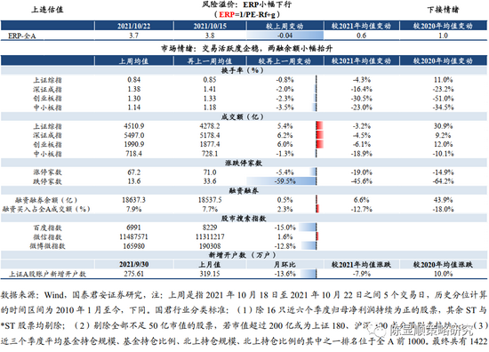 ?ERP:小幅下行0.05%。截至2021年10月22日,万得全A ERP为3.72%,较上期下行0.05%,较2021年全年均值上行0.56%。