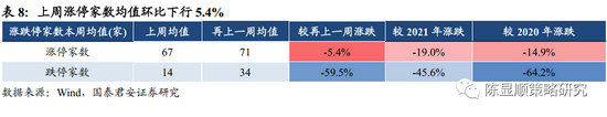 从涨跌停来看,涨停家数和跌停家数均下降,跌停家数下降明显。上周全A涨停家数为日均67家,较再上一周的71家环比下行5.4%;跌停家数为日均14家,较再上一周的34家环比下行59.5%。