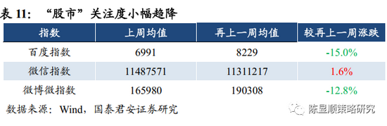 主要搜索指数关于“股市”的关注度降幅小幅下降。百度指数和微博微指数环比分别下行15.0%和12.8%,微信指数较为稳定,环比上行1.6%。从搜索指数的历史表现来看,可以观察到当市场波动较大或趋势性较强时,同期常伴随着搜索指数明显上升。本期市场小幅震荡,可以观察到股市关注度波动浮动较小。
