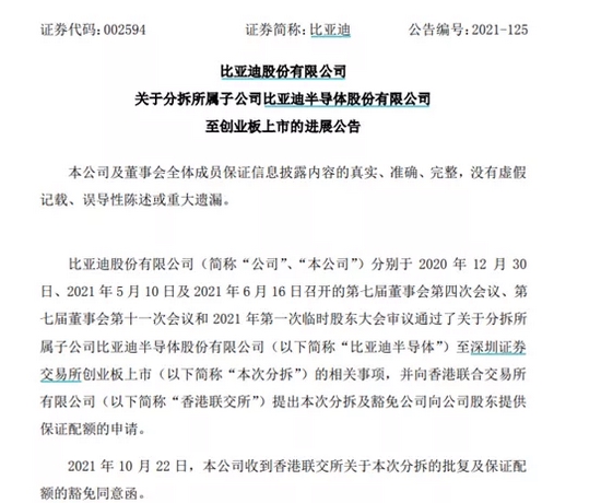 比亚迪昨日晚间发布公告称,公司分别于 2020 年 12 月 30日、2021 年 5 月 10 日及 2021 年 6 月 16 日召开的第七届董事会第四次会议、第七届董事会第十一次会议和 2021 年第一次临时股东大会审议通过了关于分拆所属子公司比亚迪半导体股份有限公司(以下简称“比亚迪半导体”)至深圳证券交易所创业板上市(以下简称“本次分拆”)的相关事项,并向香港联合交易所有限公司(以下简称“香港联交所”)提出本次分拆及豁免公司向公司股东提供保证配额的申请。公告称,2021 年 10 月 22 日,公司收到香港联交所关于本次分拆的批复及保证配额的豁免同意函。