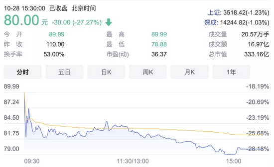 今日成大生物登陆科创板,随后开盘破发低开18.19%,盘中跌幅一度扩大至25.46%。截至全天收盘下跌27.27%,报80.00元/股。受其拖累,成大生物母公司辽宁成大开盘后一路走低,截至全天收盘股价跌停。