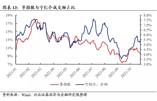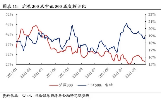本周,中证1000、创业板指、科创50和深证成指交易拥挤度上行,上证指数、中证500、中证800、沪深300、茅指数和宁组合成交热度有所下行。具体来看,截止2021/10/28,沪深300成交额占全部A股成交额的比重(MA5,下同)为28.53%,处于24.8%的历史分位,环比上周下降0.93%;中证500成交额占比为18.88%,处于33.0%的历史分位,环比上周下降0.17%;创业板指成交额占全部A股的比重为20.79%,处于88.8 %的历史分位,环比上周上涨0.28%;科创50成交额占全部A股的比重为4.05%,处于82.1 %的历史分位,环比上周上涨0.26 %;茅指数成交额占比为9.74%,处于93.0%的历史分位,环比上周下降0.8 %;宁组合成交额占比为5.21%,处于93.8%的历史分位,环比上周下降0.65%。