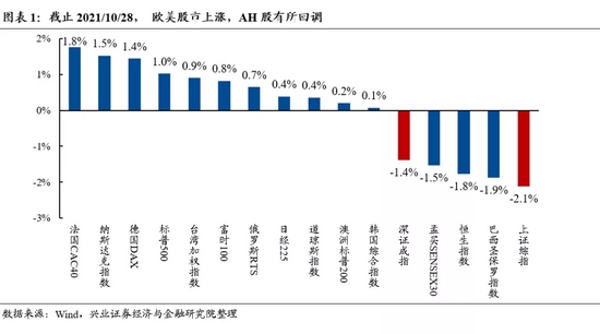 欧美股市上涨,AH股有所回调。过去5个交易日(2021/10/22-2021/10/28,下文的本周均为该区间)发达市场股市普遍表现较好其中,法国CAC40指数领涨,纳指上涨1.5%,标普500上涨1.0%,日经2225和道指上涨0.4%。本周AH股跌幅较大,上证综指和深证成指下跌2.1%、1.4%,港股恒生指数下跌1.8%。