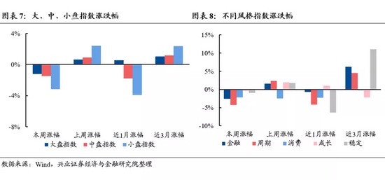 ——市场风格:市值角度,大盘指数下跌1.2%,中盘指数下跌1.5%,小盘指数下跌3.2%;板块角度,成长风格(-0.4%)表现较好,周期风格(-4.3%)表现较差。