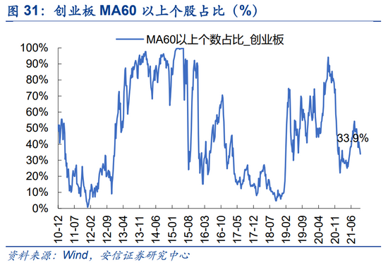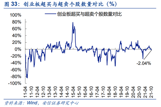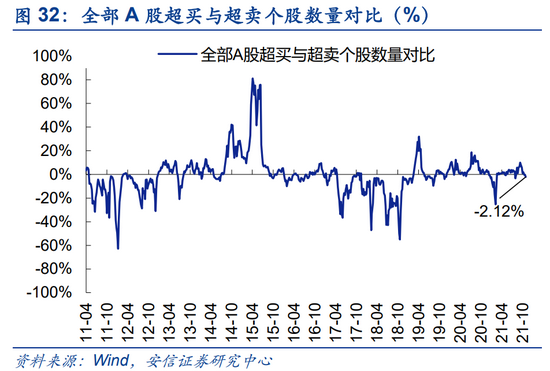 本周市场震荡,创业板指表现较强。当前市场强势个股数量占比37.9%,近一周回落3.0个百点;超买个股与超卖个股之差占比-2.1%,近一周回落-1.8个百分点。创业板来看,强势个股数量占比33.9%,近一周回落个3.0百分点;超买个股与超卖个股之差占比-2.0%,近一周回落1.0个百分点。