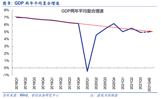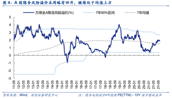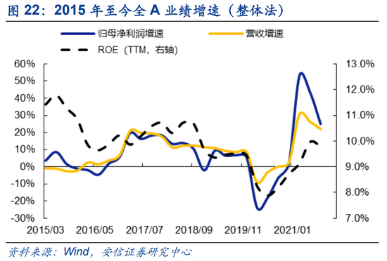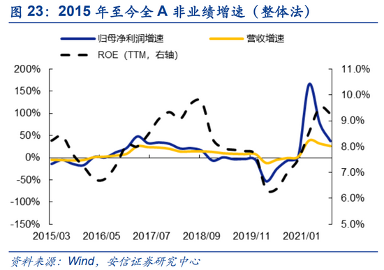 2021年三季报全A归母净利润累计同比正增长25.03%,营收累计同比为22.02%,分别较H1累计增速下滑18.50pct和4.20pct;年化2019年同期年化同比增长8.57%和11.74%,分别较H1年化增速下降0.24pct和上升0.08pct。ROE(TTM)也较H1有所下滑,从9.96%下降至9.80%。