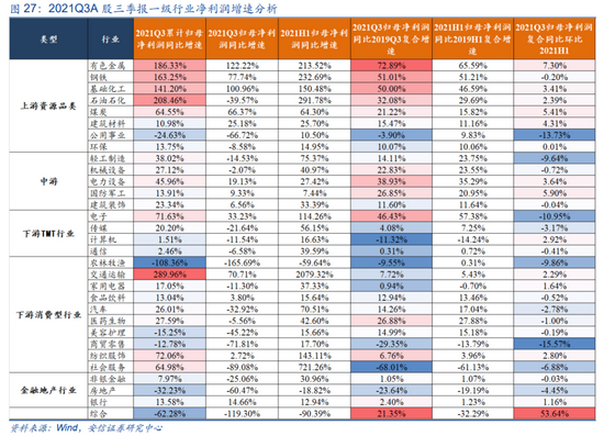 三季报A股各行业盈利增速大多较中报出现环比下滑,A股利润格局进一步向上游集中的特征更加明显,以宁组合为代表的高端制造业仍是基本面可持续增长的强者。不可否认的是,Q3上游资源品板块(有色、采掘、化工、钢铁、建材)盈利占比21.3%,达到12年以来的最高位水平,环比Q2继续提升0.4pct,同比提升6.8pct,对中下游制造业板块的利润侵蚀进一步加剧。在结构层面,。当前上中游基本面明显强于下游,周期景气》高端制造》金融》消费》科技》地产。三季报上游资源品业绩(采掘、有色、钢铁、化工等)增速依然最为突出,高端制造业“三剑客”——新能源(车)链条、半导体链条和军工链条依然高景气,其中新能源(车)是景气最核心的主线。