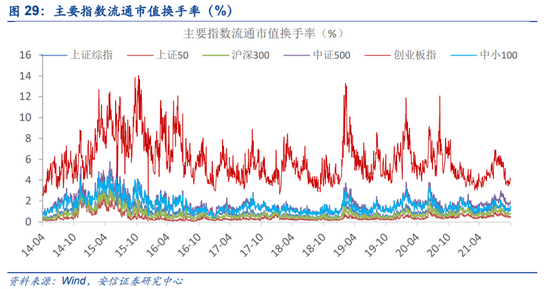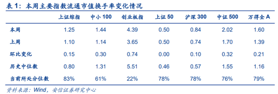 市场成交量连续三周回升。本周上证综指,中小100,创业板指,上证50,沪深300,中证500,万得全A的流通市值换手率分别为1.20%,1.24%,4.04%,0.53%,0.80%,1.89%,1.52%,分别较前一周变动+0.16,+0.07,+0.32,+0.04,+0.05,+0.22,+0.22个百分点,分别处在81%,45%,14%,80%,75%,71%,76%分位数水平。
