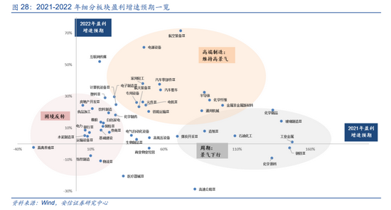 再寻找出奇点。以量价齐升为核心特征的困境反转赛道才能够实现今年下半年业绩增速环比上半年改善,同时能够做到2022年业绩增速高于2021年,部分处于业绩底部或者已经景气反转,明年盈利增速超过30%的板块开始显露较强的配置价值,主要集中在当前CPI链条中的涨价品种和新基建产业链(智能电网、专网通信、网络和数据安全、智能驾驶软件、云基础设施等);以及对那些在本轮疫情与原材料成本冲击下顽强存活,抢占市场甚至逆风成长能够显著超越对手的中小型企业的重点关注,主要集中在轻工制造(家用轻工)和机械设备(仪器仪表和专用设备)。