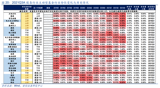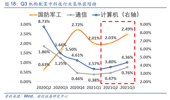 进一步理解基金三季报,最核心在于:Q3机构进一步增持以新能源(车)为核心的高端制造业,充分验证了市场对于“宁组合”的认可。在经历了核心资产的内部分化后,我们可以看到2021Q3白酒股热度在各大主动型基金中有所下降,贵州茅台和五粮液下降至第二、第四大重仓,持股市值占基金净值比分别达2.15%和1.33%,宁德时代成为第一大重仓股(2.19%)。从Q3机构持仓行业视角看,增持靠前的二级行业集中在新能源方向,其中有色的加仓主要集中在锂、钴等新能源车产业链相关的稀有金属(+1.45pct)行业,化工行业的加仓集中在其他化学制品(+1.26pct),主要是新能源中游包括锂盐、氟化工、电解液和隔膜等细分,电源设备(+1.23pct)的增持集中在光伏行业,包括逆变器、组件、硅片等领域。一个非常重要的判断是明年A股盈利增速超30%的细分领域将非常稀缺,因此能够实现业绩持续高增速板块应该放在核心位置,我们预计稀缺的高成长仍会是中期主线,以“宁组合”为核心的高端制造业高景气依然会被市场持续认可。此外,Q3部分科技行业在行业表现偏弱的前提下得到机构的增持,重点关注军工行业的持续增持与通信行业仓位见底回升。从Q3机构配置来看,2021Q1以前连续减持的科技行业,近两个季度获得持续增持,主要是计算机(+0.53pct)、军工(+0.44pct)、通信(+0.29pct),考虑到这些行业在三季度较弱的市场表现,机构的加仓意愿可见一斑。我们认为,这一现象意味着在当前新能源等高端制造业估值已不便宜的背景下,机构开始在现有高景气赛道以外寻找高成长方向,成长性作为市场配置的优先考虑项再次得到确认。具体来讲,产业互联网(+0.54pct),计算机设备(+0.12pct),通信设备制造(+0.32pct),其他军工(主要是上游材料和被动元器件)(+0.29pct),航空航天(0.15pct)。