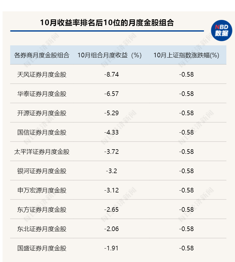 其中天风证券金股组合的收益率已连续两个月排名行业倒数第一,此外,华泰证券、东方证券、东北证券等券商9月的金股组合收益同样表现不佳。