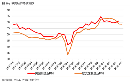 欧美两国经济继续强劲复苏。根据美国公布的最新数据显示,9月制造业PMI为61.1,其中生产PMI指数为59.4,新订单PMI指数为66.7,环比8月份基本持平,依然处在本轮扩张周期的较高水平,显示出美国制造业的复苏态势依然强劲。欧洲方面,10月PMI制造业指数为58.5,环比9月份基本持平,连续16个月位于荣枯线上方,显示出欧洲经济持续复苏的韧性很强。