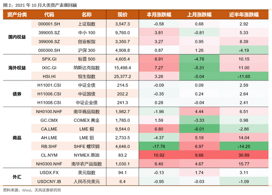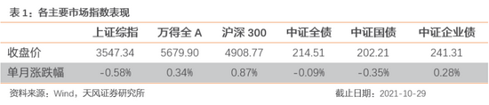 具体板块方面:1)周期在10月份继续大幅下行,在保供、限价等政策强压下,周期品从期货到股票均大幅调整。2)新能源结束近3个月的调整,大幅走高。24日中央正式发布高度空前的碳中和指导意见、22日日本加强能源政策目标、28日美国推出清洁能源投资计划,新能源板块在10月中下旬持续迎来政策利好催化,叠加三季报较多超预期业绩的披露,新能源重回市场主线。3)金融整体震荡。客观上讲,三季报来看,除了新能源业绩如期靓丽之外,银行板块的业绩表现也较突出,但市场对于银行的诟病,除了地产的冲击之外,还有实体信贷需求走弱、信贷扩张低于预期等。(4)消费在10月份表现也不错。一方面,近期多家大众品公司陆续提价,如海天、洽洽、安琪、啤酒等;另一方面,消费调整了近1年时间,左侧布局盈利底以及年底估值切换行情的资金也陆续进场。