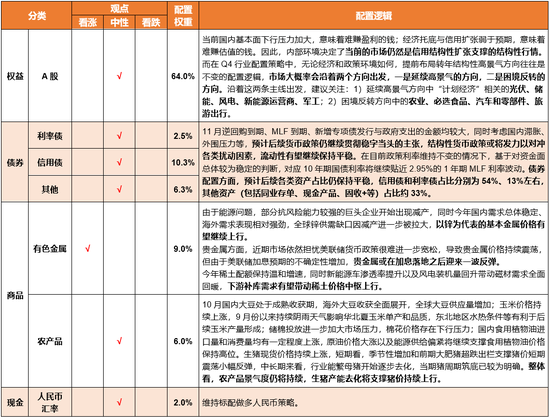 权益市场观点:四季度经济仍然面临较大下行压力,同时经济托底和信用扩张弱于预期,内部环境决定当前市场仍然是信用结构性扩张支撑的结构性行情。根据历史经验,市场往往在四季度提前布局预计转年高景气的方向,站在当前,维持两个方向的推荐:1)延续高景气的方向,首推“经济衰退下,计划经济相关”的光伏、储能、风电、新能源运营商、军工;2)困境反转的方向,主要推荐农业、必选食品、汽车和零部件、旅游出行。?