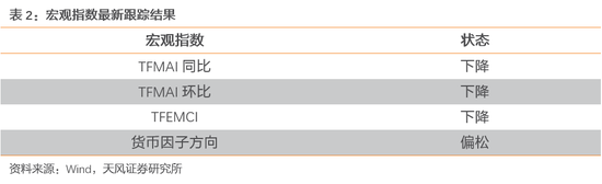 在最新一期数据中,反应经济周期的TFMAI指数同比下降、环比数据下降反应金融条件的TFEMCI有所下降,货币因子偏松。整体来看,经济数据增速放缓,实体经济货币条件有所下降,模型建议当前可适当减配债券。