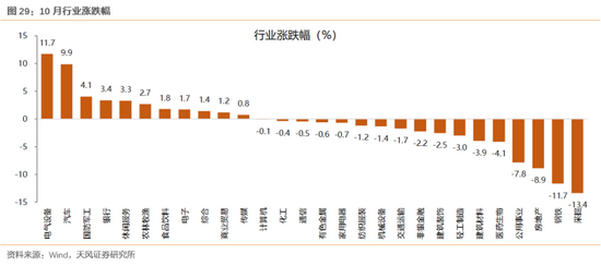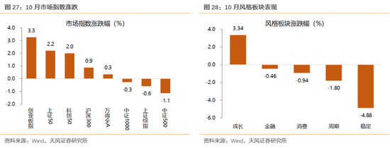 10月板块层面,成长、金融等板块表现较好,收益率分别为4.69%、1.05%,周期上游以及周期中游等板块表现较差。行业方面,电气设备、汽车、银行、休闲服务等行业表现出色,跑赢其他行业,采掘、钢铁、房地产等行业出现较大回撤。