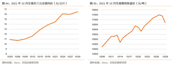 生猪现货价格持续上涨,10月生猪外三元全国均总体趋势呈上升状态,10月30日外三元生猪全国均价16.5元/公斤,较10月3日(10.89元/公斤)涨5.61元/公斤,涨幅51.52%。我们认为,短期看,受季节性消费增加叠加前期大肥猪超跌出栏,预计猪价短期或震荡小幅反弹;中长期来看,行业能繁母猪开始逐步去化,当前猪周期筑底已较为明确。