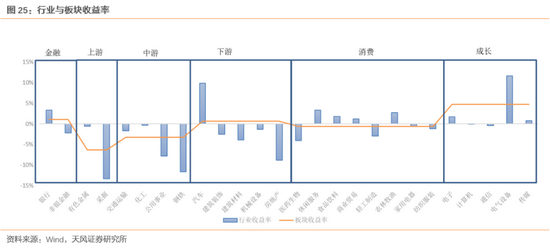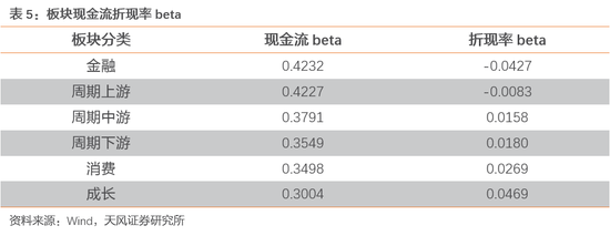 在现金流下行环境中,成长板块折现率beta显著高于周期下游板块,因此成长板块应当在现金流下行,折现率下行时进行配置。而周期下游适宜在现金流下行,折现率上行环境中配置,消费板块折现率居中,在折现率上行下行中均有配置价值。