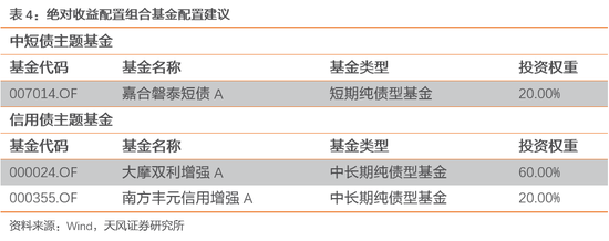 根据最新的仓位配置,我们在信用债主题基金、中短债主题基金中结合基金规模、Alpha、风险指标等维度筛选相应基金,基金推荐名单以及相应的权重配置建议如下。