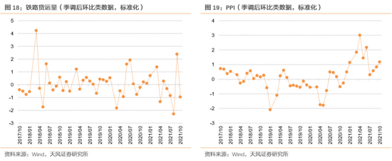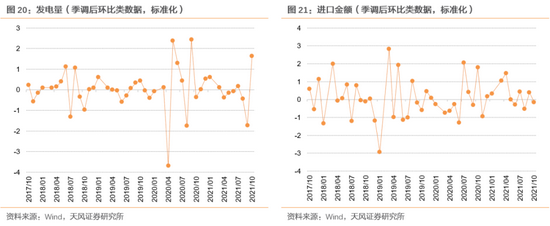 围绕制造业活动的指数主要分为三类:1)制造业景气度调查:通过采购经理的预期来反映制造业情况,我们选取国内最权威的两大景气度指数:中采PMI和财新PMI;2)制造业行情反馈:我们选取了PPI、发电量和铁路货运量,其中PPI代表工业品价格与制造业息息相关,而发电量和铁路货运量也是克强指数的关键成分,能深刻反应工业的景气度水平 ;3)进出口环境:制造业产业链复杂,往往与贸易强相关,且各国工业景气度较为同步,我们选取了进口金额、工业企业出口交货值、美国ISM制造业协会PMI。