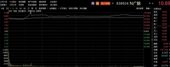 按照上述规则,精选层公司将全部平移北交所,广脉科技“抢跑”成为未来北交所首批上市公司之一。这只新股挂牌精选层首日大幅高开近73%,盘中最高涨幅达105%,全日收涨87.76%。该股全日成交额为9078万元,全天换手率为23.27%。