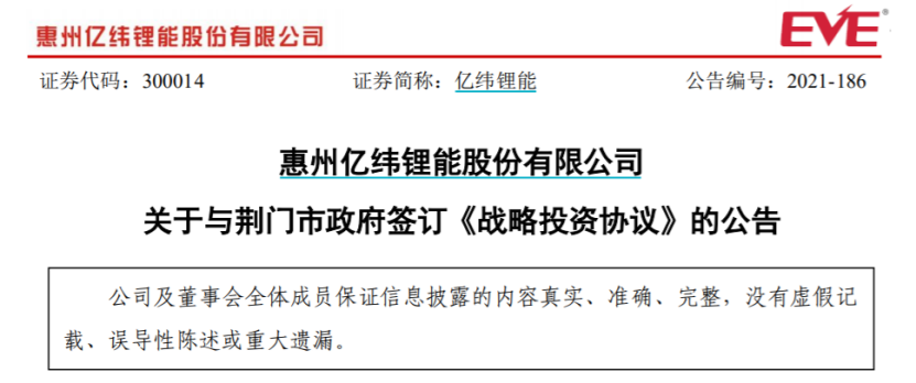 11月4日晚间,亿纬锂能公告,受益于新能源汽车行业蓬勃发展,结合公司动力储能电池项目实际情况及未来经营发展规划,11月4日,公司与荆门市人民政府签订《战略投资协议》,公司及其子公司计划在荆门市掇刀区完成固定资产投资305.21亿元,征地约3000亩,建设年产152.61GWh的荆门动力储能电池产业园项目,荆门市政府为荆门动力储能电池产业园建设和锂离子动力储能电池配套产业的引入提供必要的支持和协助。