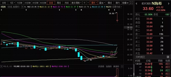 今天,普级精选层的N海希正式挂牌交易,开盘即大涨53%,盘中最高涨幅接近70%,收盘上涨53.56%,收出了一颗带长上影的阳十字星,成交金额高达2.82亿元,换手率46.39%。