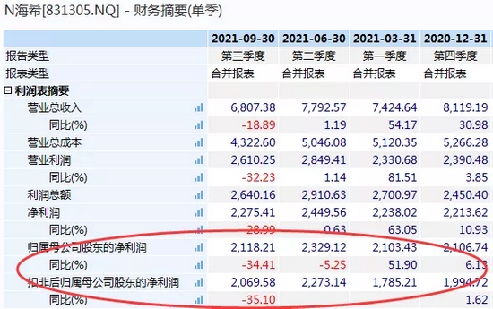 从业绩来看,N海希今年一季度同比增长巨大,但二、三季度有所下滑。