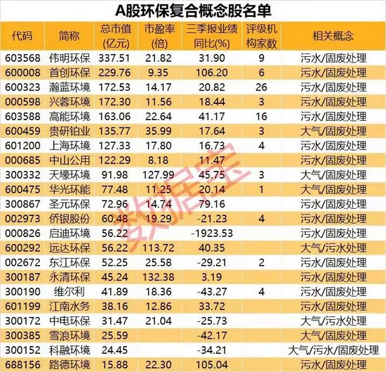 证券时报·数据宝统计,A股复合环保概念股有20余只,百亿市值个股仅8只,包括伟明环保、首创环保等市值超200亿元。瀚蓝环境、高能环境、伟明环保、首创环保受机构关注度较高,评级机构分别有26家、16家、9家和6家。