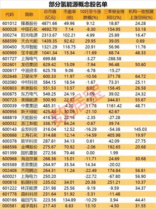数据宝统计,最新市值超过200亿元的氢能源概念股共32只。业绩同比翻倍且估值不足15倍的个股多达6只。其中,中集集团业绩增幅高达1161.42%,公司在高压储氢、运氢领域处于行业领先;上海石化氢气产能约23万吨/年,目前正在建设氢燃料电池供氢中心项目。另有卫星石化、齐翔腾达、新奥股份和中国石化4股满足业绩估值条件。