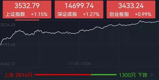 11月11日,A股三大指数震荡走强,全线飘红。截至收盘,上证指数涨1.15%,收报3532.79点;深证成指涨1.27%,收报14699.74点;创业板指涨0.99%,收报3433.24点。沪深两市合计成交额11231.74亿元,两市成交额连续第15个交易日突破1万亿元;北向资金净买入86.10亿元;总体来看,两市个股涨多跌少。