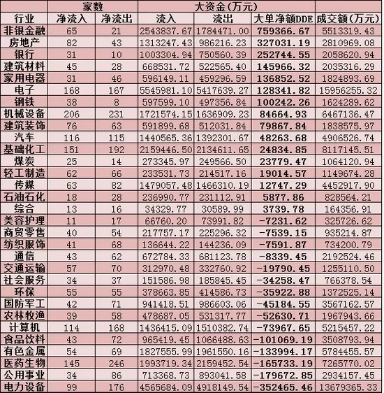 在外资回流的同时,市场大单资金也转身入场。周四,整个A股市场大单资金在多日净流出后,开始呈现净流入态势,合计大单资金净流入达92.77亿元。从申万一级的行业来看,有16个行业呈现资金净流入态势。其中,非银金融、房地产、银行等3个行业资金净流入均超20亿元,分别为75.94亿元、32.7亿元和25.27亿元,合计达133.91亿元。另外,电力设备、公用事业、医药生物、有色金属、食品饮料等行业,资金净流出均超10亿元。